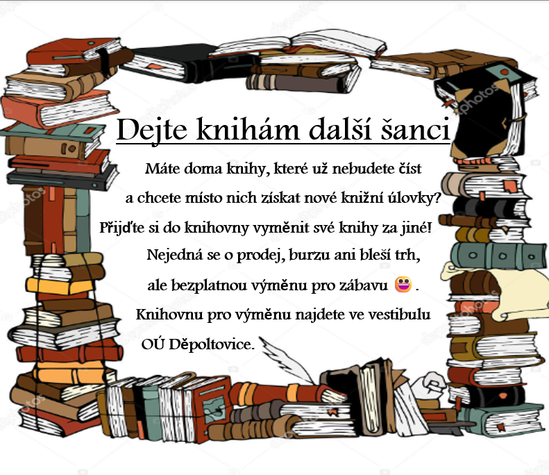 Knihovna v Děpoltovicích pořádá akci, kde můžete vyměnit své nečtené knihy za nové. Nejedná se o prodej, ale o bezplatnou výměnu pro zábavu. Přijďte do vestibulu OÚ Děpoltovice a objevte nové knižní úlovky.